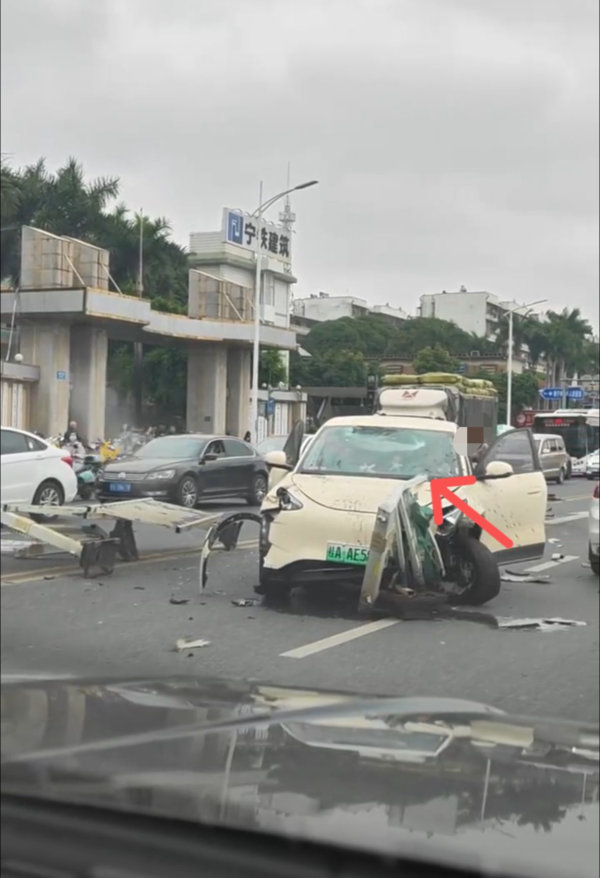 视频显现,路途中心的阻隔栏被撞翻,一辆新能源轿车停在对向车道,车头受损严峻,左前轮简直瘪掉。一根路途阻隔栏杆早年挡风玻璃直接刺入车内,穿过驾驭位区域,穿透座椅靠背,局面惊险。现场一名司机在打电话,周围还停着一辆开着双闪的白色小车。